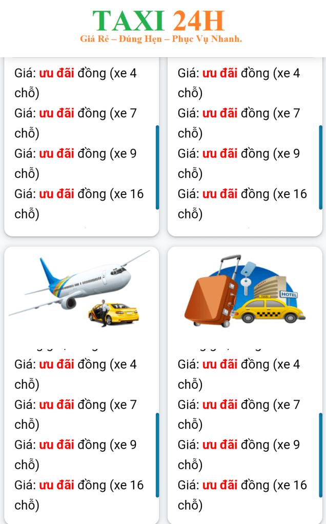 Chúng tôi có các loại xe đa dạng từ 4 chỗ, 7 chỗ và 16 chỗ , phục vụ cho mọi nhu cầu của khách hàng. Nếu bạn cần di chuyển từ sân bay, ga đến khách sạn, nhà hàng, thăm quan du lịch hoặc đi công việc, hãy liên hệ với chúng tôi để được phục vụ tốt nhất.
